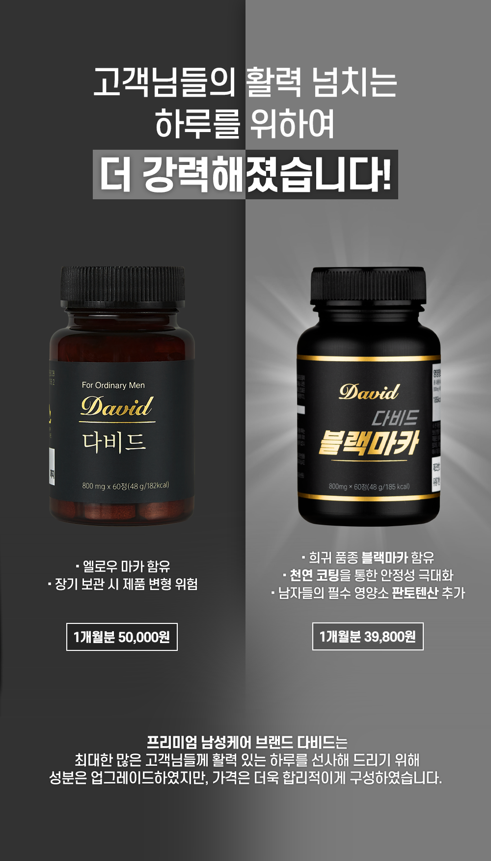 다비드 [단종] 다비드 남성 활력제2+1 이벤트 남자에게 좋은 마카와 아르기닌이 듬뿍 들어있는 남성활력제, 다비드 92%39,800원504,000원 3.673전체보기 배송 안내 무료배송(도서산간제외) 월요일 오전 11시 배송 출발 (영업일 1~2일 소요) 에코비밀포장 회원 혜택 결제금액 2% 포인트 적립 리뷰시 결제금액 3% 포인트 적립 리뷰시 5% 할인 쿠폰 증정 단종된 상품입니다.