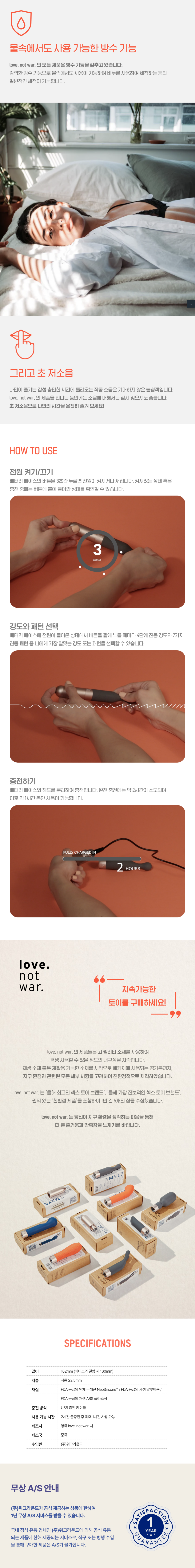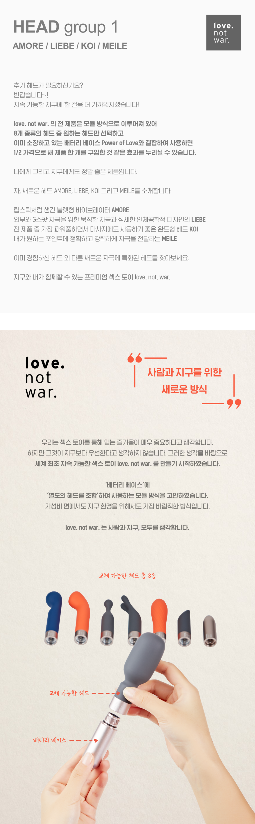 저는 환경에 관심이 있는 편이라 친환경 토이에 대한 흥미가 있었고, 하나의 배터리에 여러 헤드를 교체하여 다양한 제품처럼 즐긴다는 취지도 좋지만 반대로 왜 토이들의 사용시간은 늘 한정적일 수 밖에 없을까라는 아쉬움이 크게 있었기 때문에 여러 배터리를 구비해 자주 충전해야 하는 번거로움을 줄이고, 만족스러울 때까지 즐길 수 있다는 점에서 러브 낫 워 제품을 추천해요. 그리고 저는 디자인을 중요하게 여기는데 러브 낫 워의 제품들은 굉장히 세련되어서 한 눈에 반할 수 밖에 없었어요. 다만 컬러 선택이 자유로웠으면 앞으로 헤드를 수집할 때 통일성을 주고싶어서 개인적으로 더 좋았겠지만 영국 공홈에서도 나오지 않아 어쩔 수 없는 부분이네요.