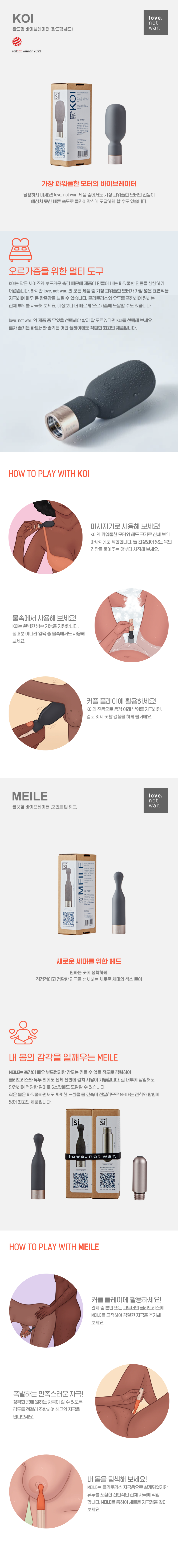 저는 리베, 코이 2가지 헤드와 배터리 3개를 사용중이에요. 코이는 리베나 이제까지 사용했던 다른 토이와는 비교할 수 없을 정도로 매우매우 강력한 파워를 가지고 있네요!! 먼저 사용하던 리베도 괜찮다고 생각했는데 코이는 정말 놀랐습니다. 1, 2단계는 배터리가 부족한 것처럼 덜덜거리는 아주 약한 진동을 주는데, 3, 4단계는 극적으로 세고 정말 처음 경험해보는 자극이에요. 저는 불감증이 있는 편이어서 시간을 가지고 오래 즐기려고 하는 경향인데요 리베는 배터리를 계속 교체하며 3시간 사용한다 하면, 코이는 5분 안에 끝납니다.. 모두 같은 배터리에 헤드만 다른데 어떻게 다른 세기의 진동을 주는지 신기해요. 코이는 차분한 색상과 자극력이 장점이고 리베는 삽입으로도 즐길 수 있고 핸들링이 편한 장점이 있어요.